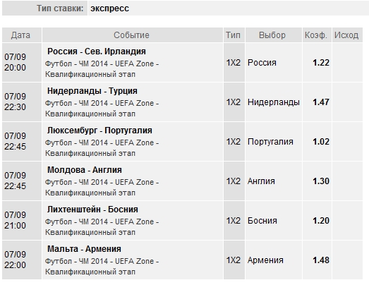 CSKA_Malek, Согласен с Futurzoid, помню как-то раз поставил. Матч Панатинаикос и какое-то греческое УГ. Кэф на победу Панатинаикоса был около 1.10. Они сыграли в ничью. Экспресс слетел. Да и вообще, лучше ставить на чемпы первой пятерки-семерки, чем на этих эстонцев и т.д.
