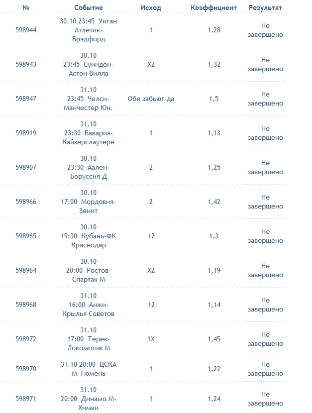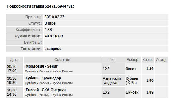 Номер ставки: 83811165 Сумма ставки: 100 Тип ставки: Экспресс Общий коэффициент: 74,51 Время ставки: 27.10.2012 5:17 Результат: Проиграл Сумма выигрыша: 0 № Событие Исход Коэффициент Результат 592863 27.10 15:45 Астон Вилла-Норвич 1X 1,26 Выиграло [1-1(1-0)] 592860 27.10 18:00 Уиган Атлетик-Вест Хэм X2 1,62 Проиграло [2-1(1-0)] 592861 27.10 20:30 Манчестер Сити-Суонси 1 1,22 Выиграло [1-0(0-0)] 592855 28.10 17:30 Эвертон-Ливерпуль X 3,25 Выиграло [2-2(2-2)] 592864 28.10 19:00 Саутгемптон-Тоттенхэм 2 1,82 Выиграло [1-2(0-2)] 592865 28.10 20:00 Челси-Манчестер Юн. 2 2,85 Выиграло [2-3(1-2)] 595566 27.10 13:30 Спартак М-Мордовия 1 1,25 Выиграло [2-0(1-0)] 595565 27.10 18:30 Алания-Зенит 2 1,42 Выиграло [2-3(2-1)]