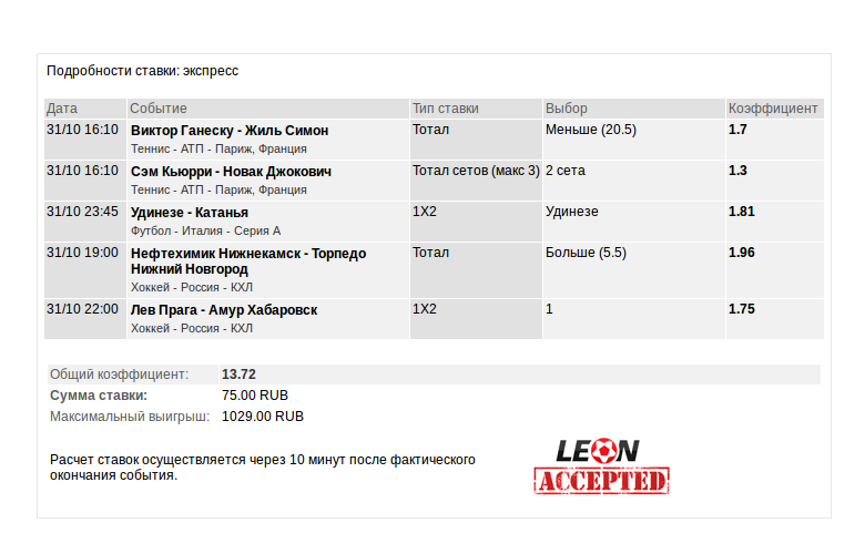 № Событие Исход Коэффициент Результат 599714 31.10 17:00 Нефтехимик-Спартак Нал. 2 2,75 Не завершено