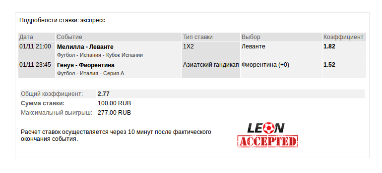 Купон N3323709453 от 01.11.2012 14:20:30 Экспресс Коэффициент = 2.04 Дата Событие Выбор Коэф Результат Счет 01.11 20:00 Вальядолид - Бетис: Обе забьют да 1.70 Не рассчитана 01.11 23:55 Депортиво - Мальорка: Депортиво забьет да 1.20 Не рассчитана Поставил