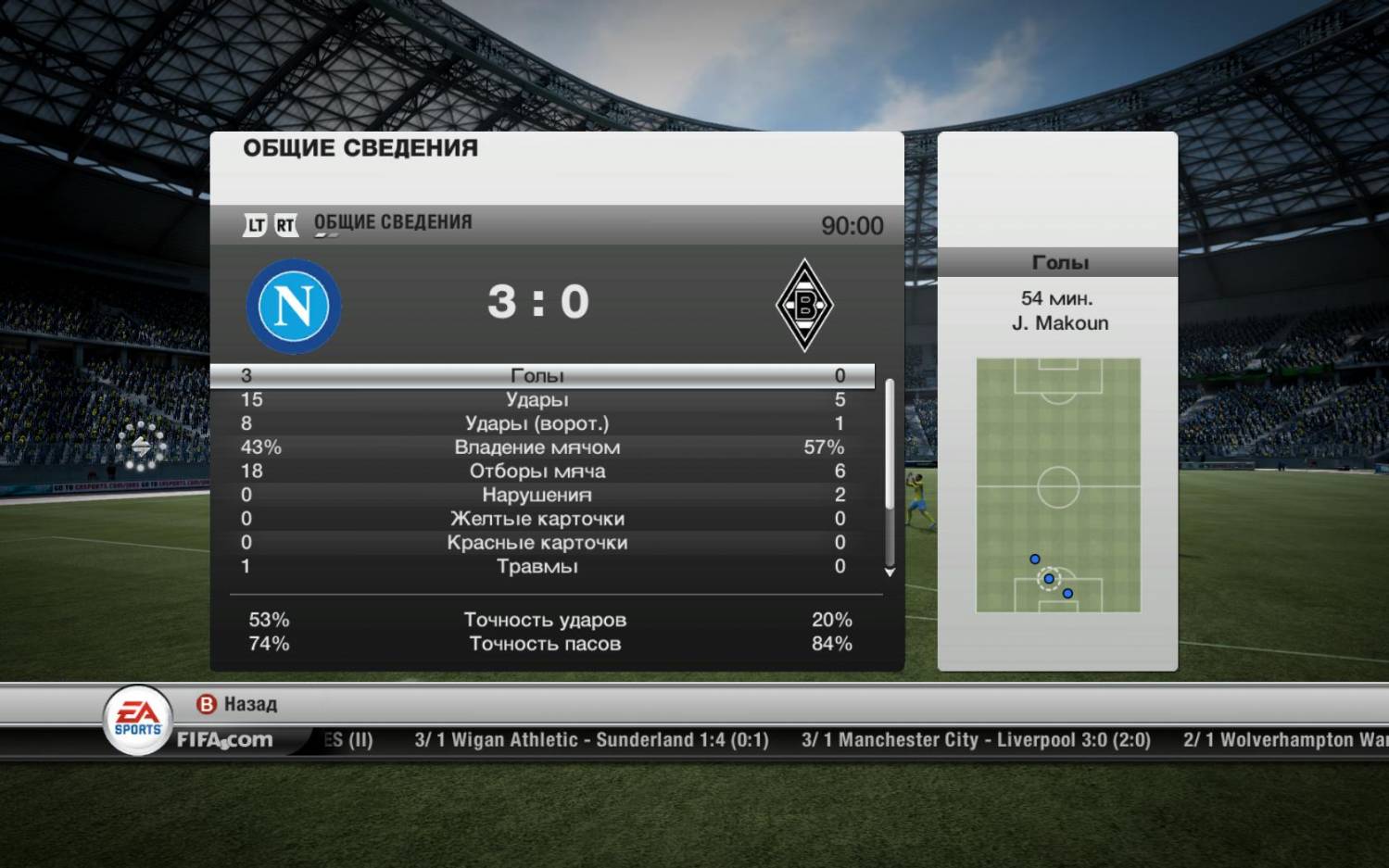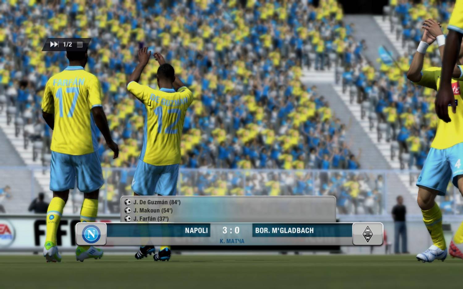 Итак, новости от команды Наполи в перерыве между сезоном, команды проводят товарищеские матчи, и Наполи не стал исключением! Только что завершился товарищеский матч Наполи - Боруссия Мёнхенгладбах, игра проходила в дружественной атмосфере, игроки Наполи играли с удовольствием, но в тоже время готовились к предстаящему офицальному матчу в Лиге Чемпионов против грозного соперника Барселоны! Счёт был открыт на 37мин. новичком команды Jeffersonom Farfánom, который офицально ещё не перешел, но его команда Реал Мадрид, так же оказалась на сборе в солнечной Саудовской Аравии, он решил показать, что деньги за него заплатят не зря! Игоки обеих команд тронжирили момент за моментом, но это и не странно всё таки тов.матч, хочется забить красиво, но на 54мин. Makoun прекрасно сыграл в стеночку с Mirallasom и вышел 1*1 и не оставил шансов голкиперу пробив мощно в ближний угол. В конце матча игроки Боруссии уже мысленно отдыхали, и за это поплатились, на 84мин. De Guzman красивым ударам из-вне штрафной забил внешней стороной стопы, и поставил жирную точку, итоговый счёт 3:0, крупная победа Неаполетанцев, и хорошое впечатление о предстоящей покупке Farfane. Вот некоторая статистика встречи: