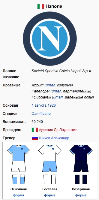 « На́поли» (итал. S.S.C. Napoli) — итальянский футбольный клуб из Неаполя, основан в 1926 году. В настоящее время играет в Серии А. Цвета клуба — лазурно-белые. Домашний стадион — «Сан-Паоло». «Наполи» — двукратный победитель чемпионата Италии (1986—1987, 1989—1990), трёхкратный обладатель Кубка Италии. На европейской арене клуб имеет одно весомое достижение — победа в Кубке УЕФА 1988—1989. «Наполи» является одним из сильнейших клубов Южной Италии и 4-й командой страны по количеству болельщиков. Начиная с момента основания в 1926 году клуб несколько раз менял название. Изначально он назывался Associazione Calcio Napoli, в 1964 году команда была переименована в Società Sportiva Calcio Napoli и называлась так до 2004 года, когда «Наполи» постигло банкротство. Новый президент Аурелио Де Лаурентис возродил клуб под названием Napoli Soccer. В 2006 году он решил вернуть старое название — Società Sportiva Calcio Napoli.
